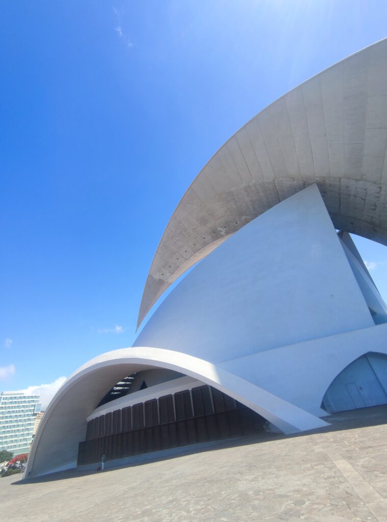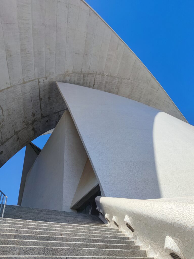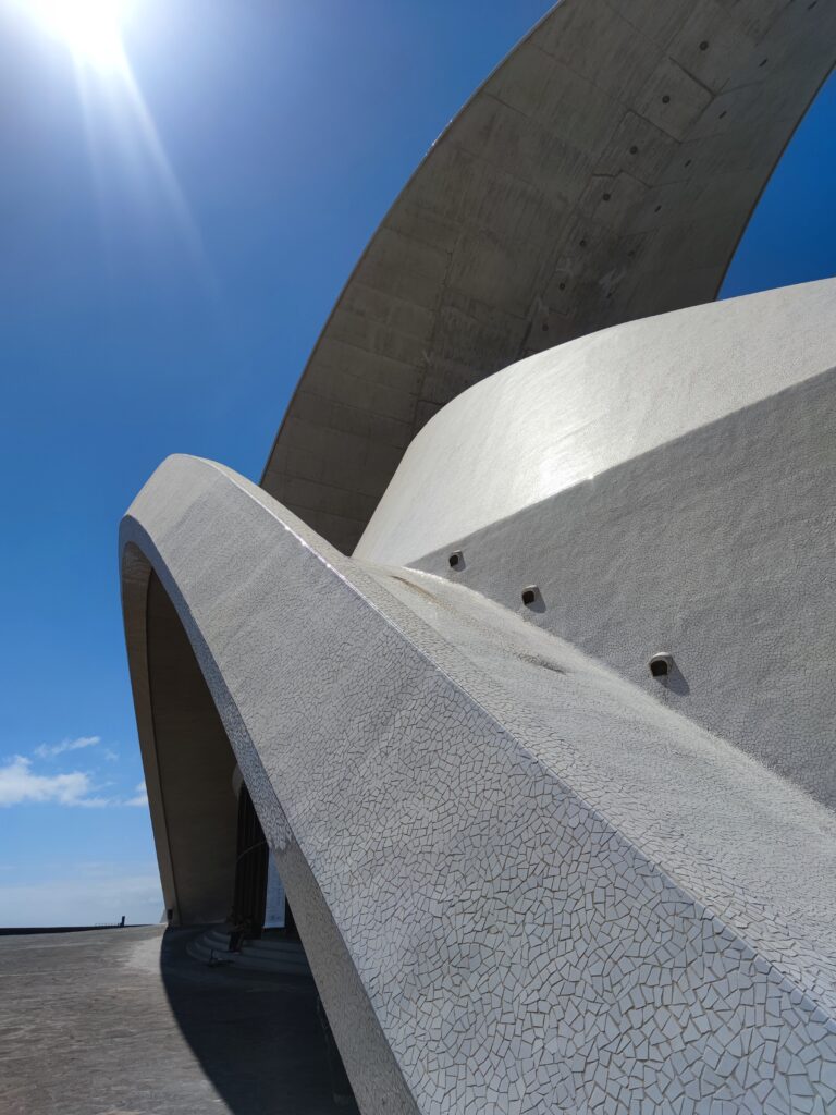 Jeśli pierwszy raz widzisz Auditorio de Tenerife i jeszcze nic o nim nie wiesz, możesz odnieść wrażenie, że to nie budynek, a rzeźba. Pojawia się zupełnie nieoczekiwanie, wśród prostych, kubicznych budynków, na tle wszechobecnego na Teneryfie oceanu. Z oddali nie wydaje się duży – raczej filigranowy i fikuśny, choć w żadnym wypadku nieprzegadany. Jednolity biały kolor elewacji wydobywa rzeźbiarskie kształty i cienie.