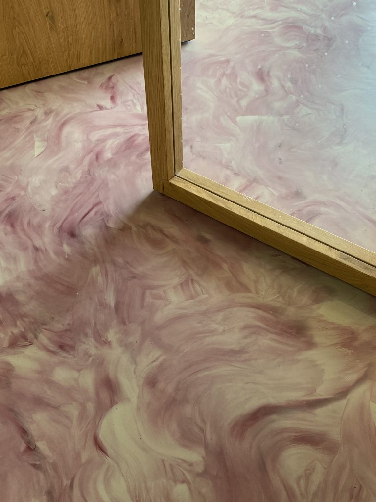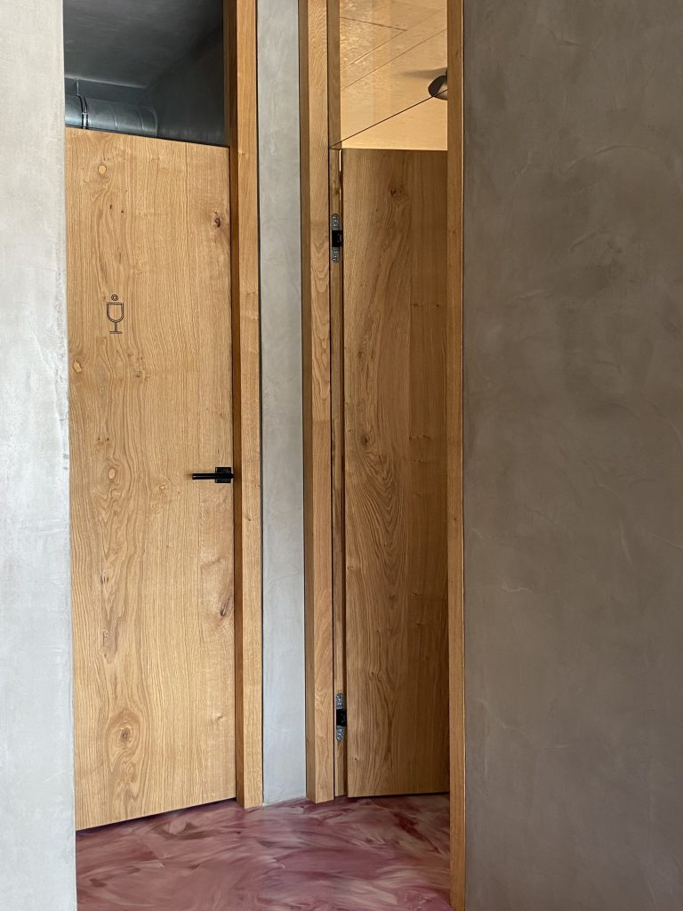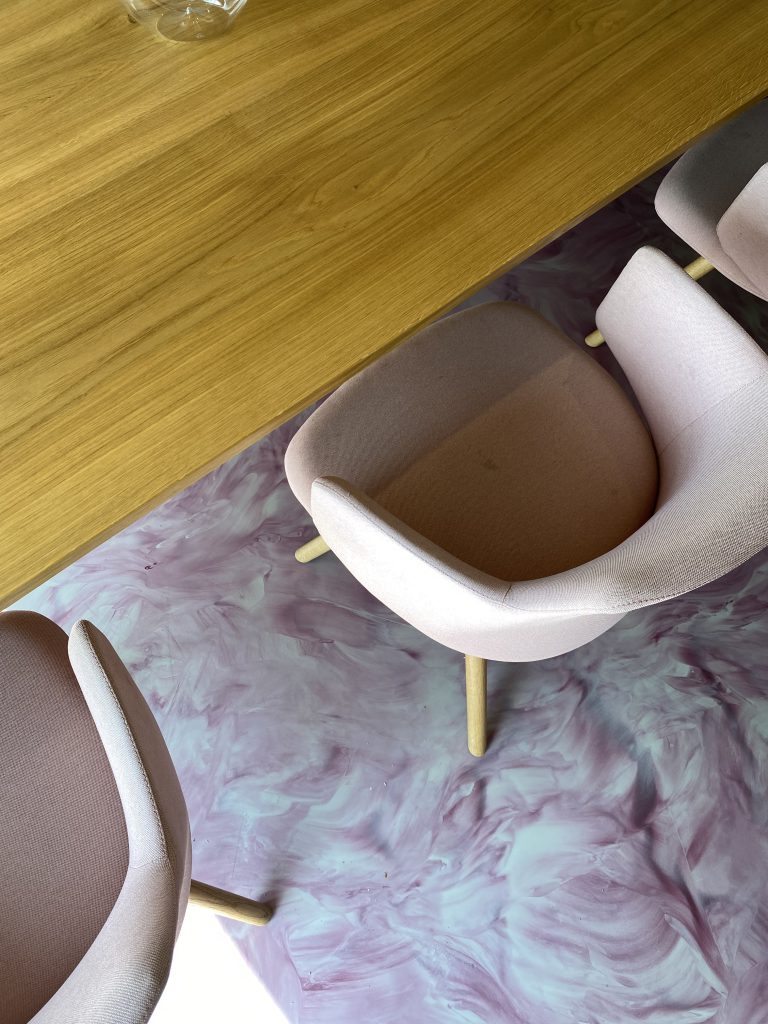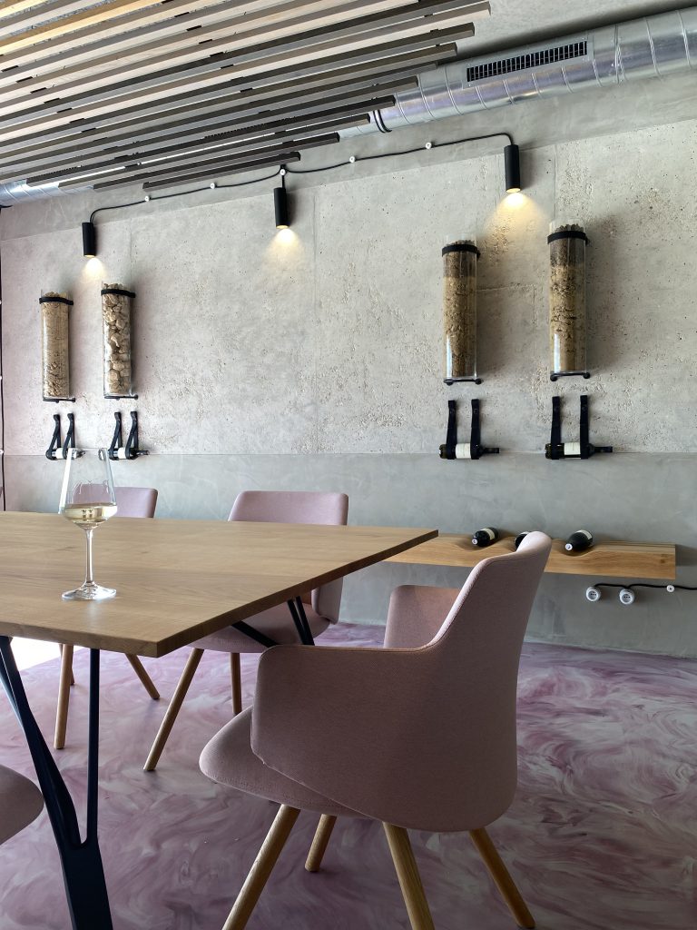Za progiem winiarni w pierwszej chwili widzisz właściwie tylko jeden element – winną posadzkę! Mieniąca się odcieniami różu, burgundu i fioletu jednolita masa przyciąga wzrok i dominuje zmysły. Jest to przeciekawe i jakże zgubne wrażenie. Mimo, iż sama często stosuję mikrocement w moich realizacjach, jeszcze nie widziałam takiej fantazji w jego opracowaniu.
