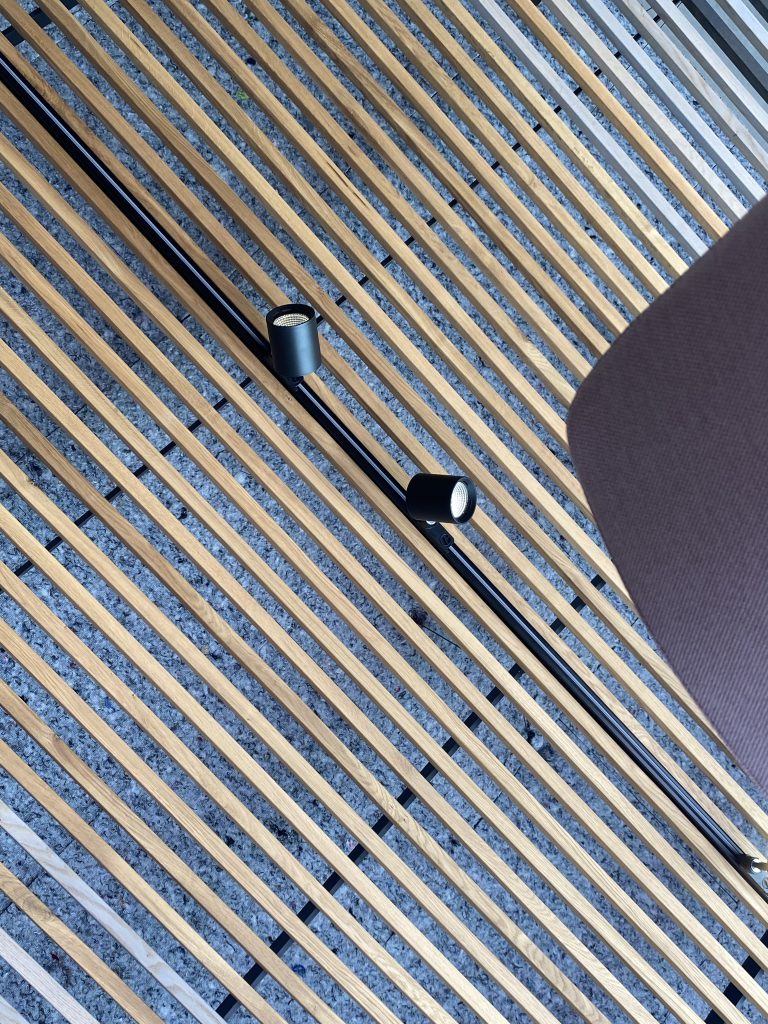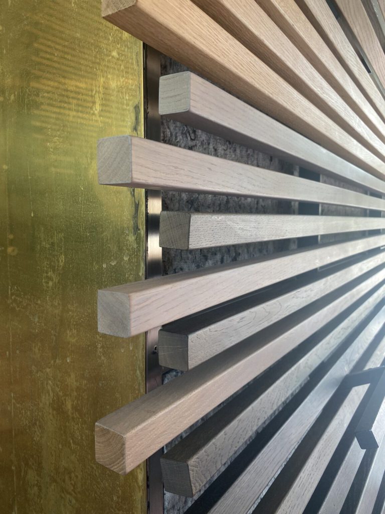 Oryginalne i mądre wykorzystanie kontówek drewnianych polepsza akustykę pomieszczeń umożliwiając korzystanie z tej niewielkiej przestrzeni przez wiele osób jednocześnie. Zobacz jak sprytnie Projektanci ukryli maty akustyczne w sali konferencyjnej i w bryle baru.